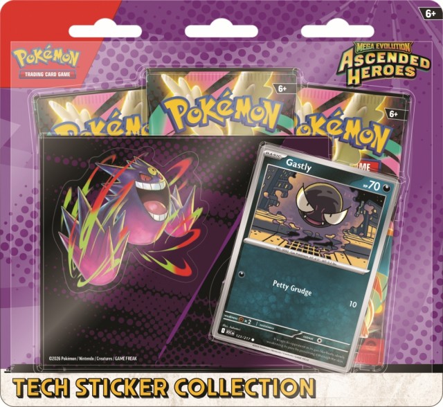 kombinerer samleglede med kreative detaljer. Pakken inneholder et eksklusivt folie-promokort av Gastly, tre boosterpakker fra Ascended Heroes-settet og et klistremerkeark med Gastly og Mega Gengar – perfekt til dekorasjon av mapper, esker eller tilbehør.