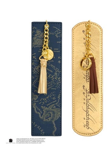 Elven Script-bokmerket er laget i gullfarget kunstskinn og har et trykk av skriften på Den ene ringen, en brun dusk samt et gullfarget metallanheng av Den ene ringen med inngravert tekst, festet i en gullkjede.