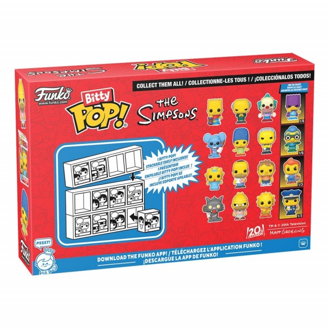 The Simpsons – Bitty POP! Vinyl Figure 4-Pack Series 4 (2 cm) Fra Funkos Bitty POP! serie kommer denne 4-pakken med minifigurer fra The Simpsons! Hver figur er ca. 2 cm høy, laget i vinyl og levert i en egen akrylboks med klassisk POP!-design. Med følger også en stablebar display for å samle og vise frem alle figurene sammen.