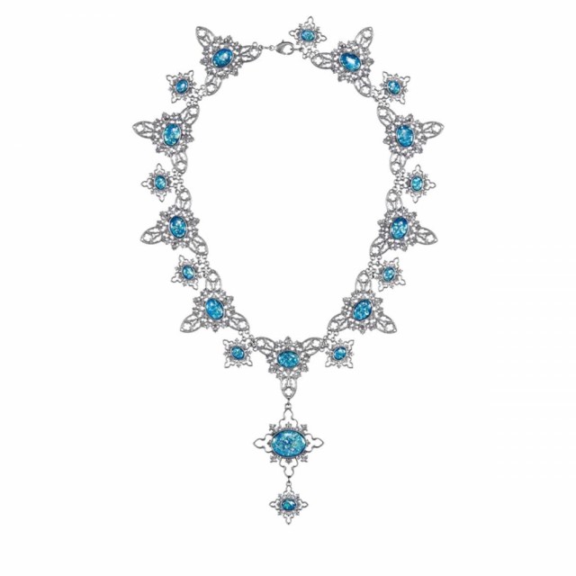 «Ikke rør! Forbannet.» Denne replikaen gjenskaper alle de uhyggelige detaljene fra det forbannede opalhalskjedet fra Harry Potter og Halvblodsprinsen. Det sies å være fryktelig forbannet, og halskjedet holdt nesten på å koste Galtvort-eleven Katie Bell livet. Halskjedet er utstyrt med 20 iriserende blå steiner og detaljerte metallornamenter i antikk sølvfinish. Oppbevar det trygt – eller vis det frem – i den 33 cm høye samleboksen i kunstskinn. Boksen har metallspenner og er foret med mykt svart velurstoff. Selve halskjedet måler omtrent 16 x 30 cm og har justerbar lås.