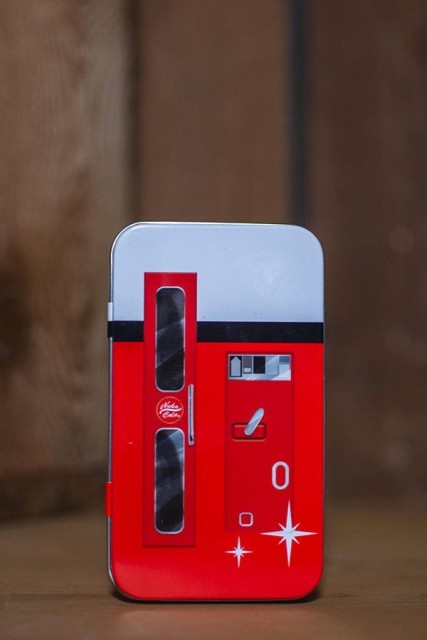 Settet inkluderer pin, blikk-skilt, kjøleskapsboks med mynt, glassflaske med 10 kapsler, blikkboks med 20 kapsler, trykt eske og dekorativ emballasje.